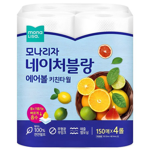 - 모나리자 네이처블랑 에어볼 천연펄프 롤키친타올, 150매, 4개입