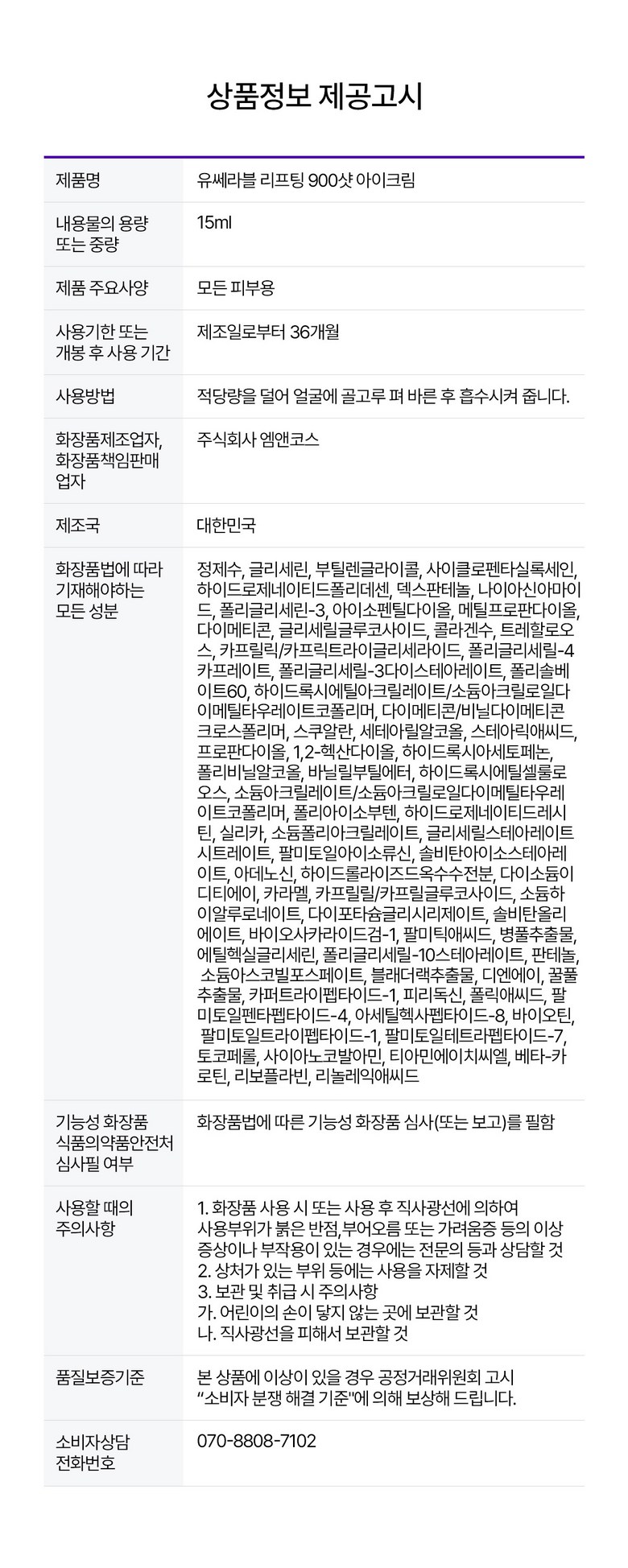 | 소비자 상담 관련 전화번호 | 상품페이지 참고 |