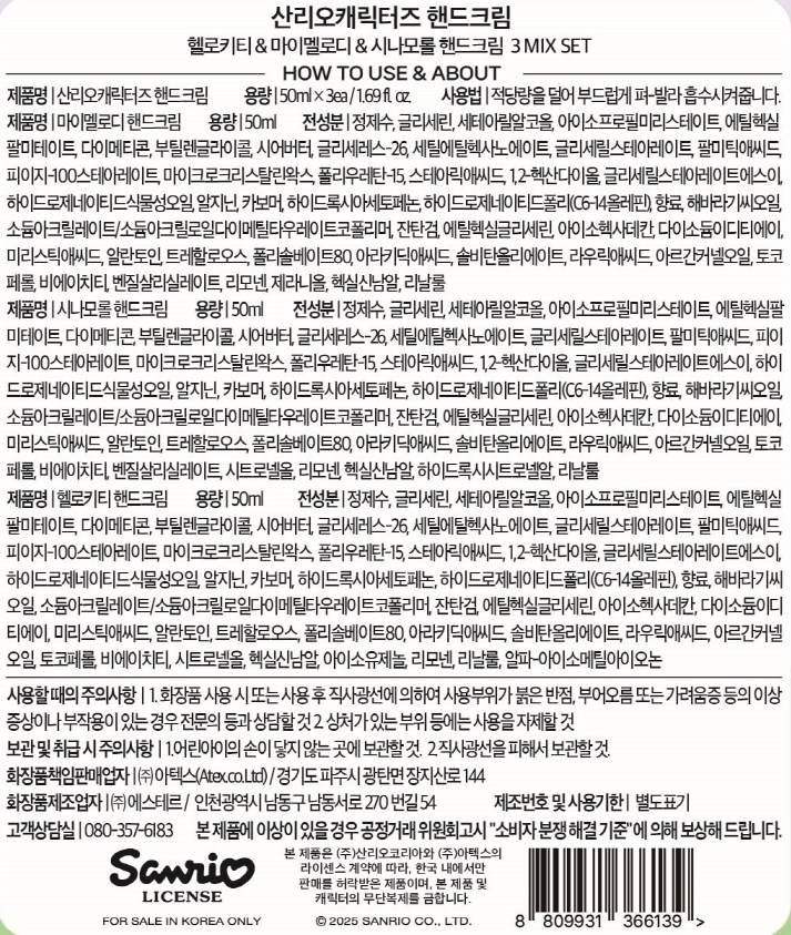 - 아텍스 산리오캐릭터즈 핸드크림 50ml x 3종 세트, 1세트