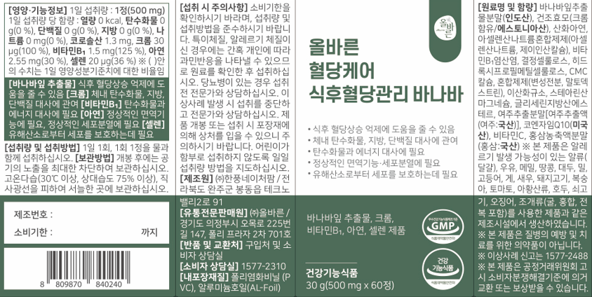 - 올바른 혈당케어 식후혈당관리 바나바, 60정, 1개