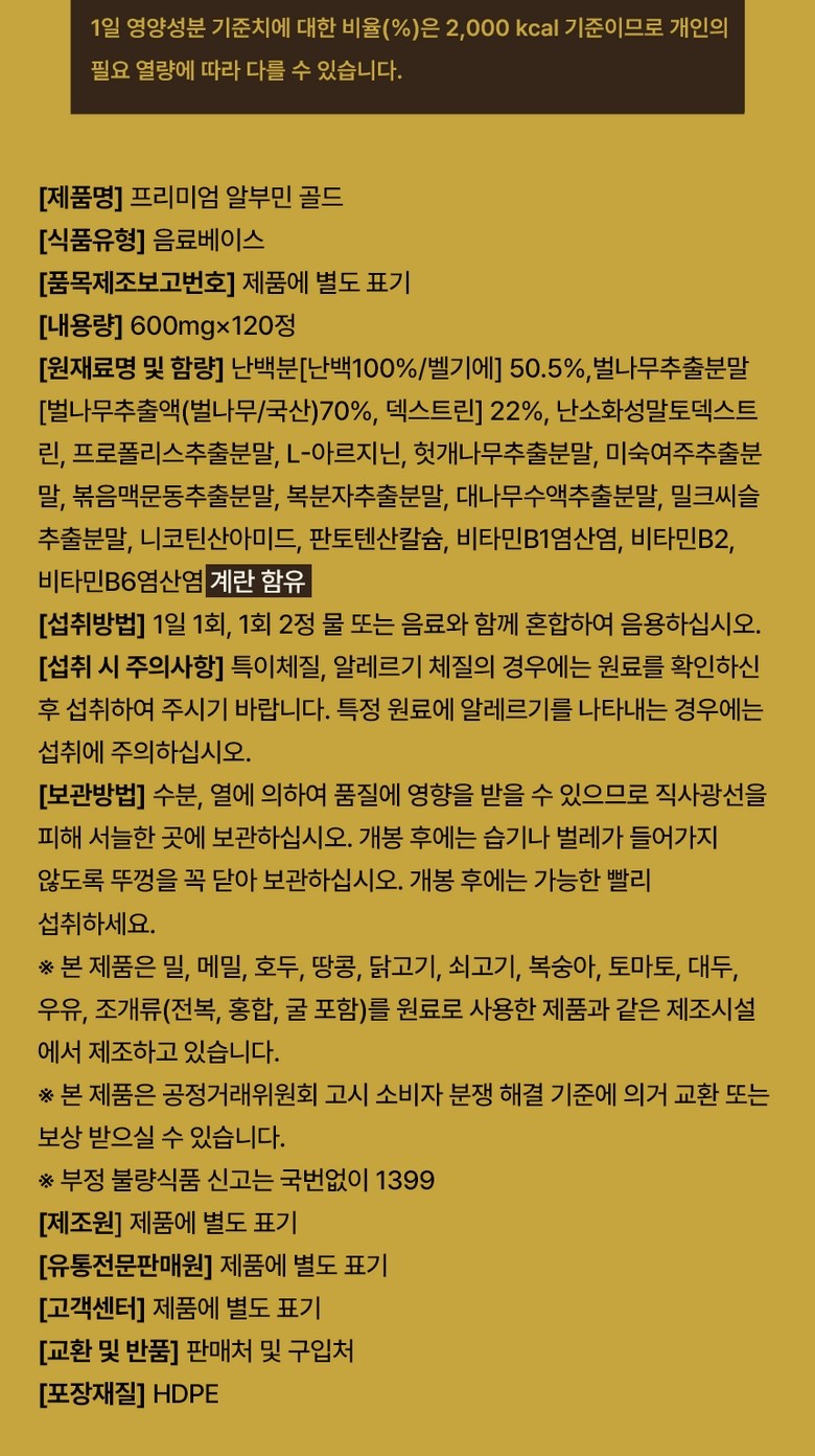 - 알부민 프리미엄 골드 식약청 인증 HACCP 맥스 플러스 최대함량, 1개, 120정