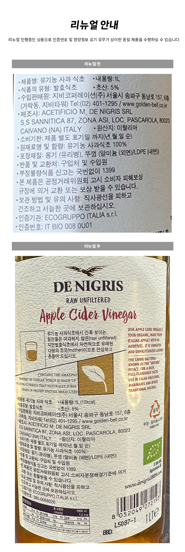 - 데니그리스 유기농 사과 식초, 1L, 1개