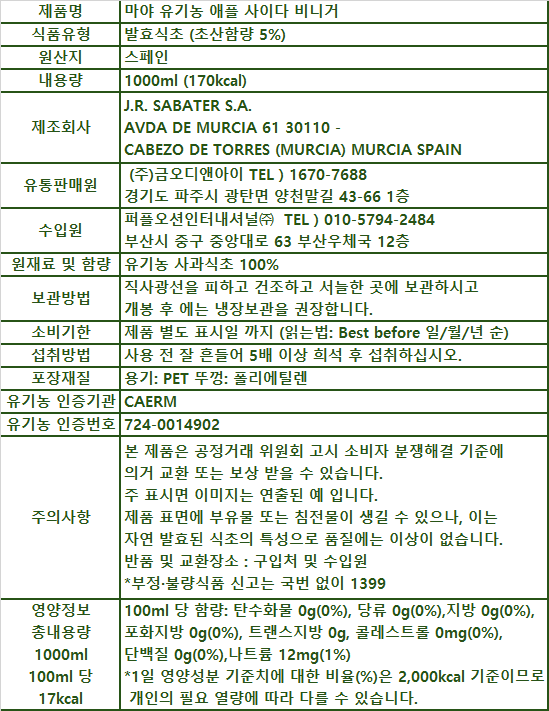 - 마야 유기농 애플 사이다 비니거, 1L, 2개