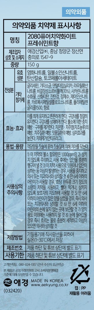 - 2080 퓨어 치약 크리스탈솔트 화이트프레쉬민트향, 150g, 6개