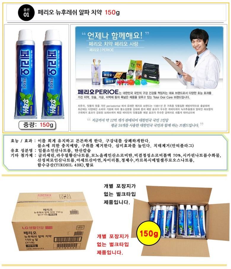 - 페리오 뉴 후레쉬 플러스치약, 150g, 18개