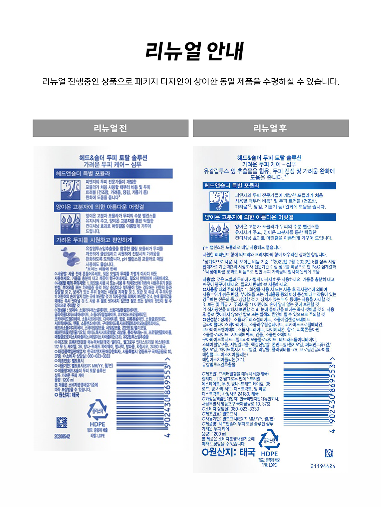 - 헤드앤숄더 토탈 솔루션 가려운 두피 케어 샴푸 페퍼민트 프리지아 향, 1.2L, 1개