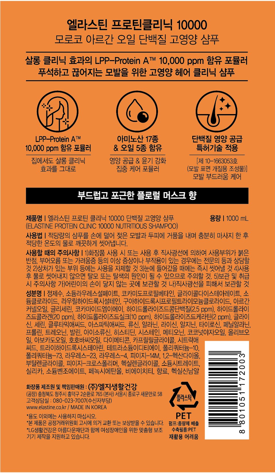 - 엘라스틴 프로틴 클리닉 10000 모로코 아르간 오일 단백질 고영양 샴푸 플로럴 머스크 향, 1L, 2개