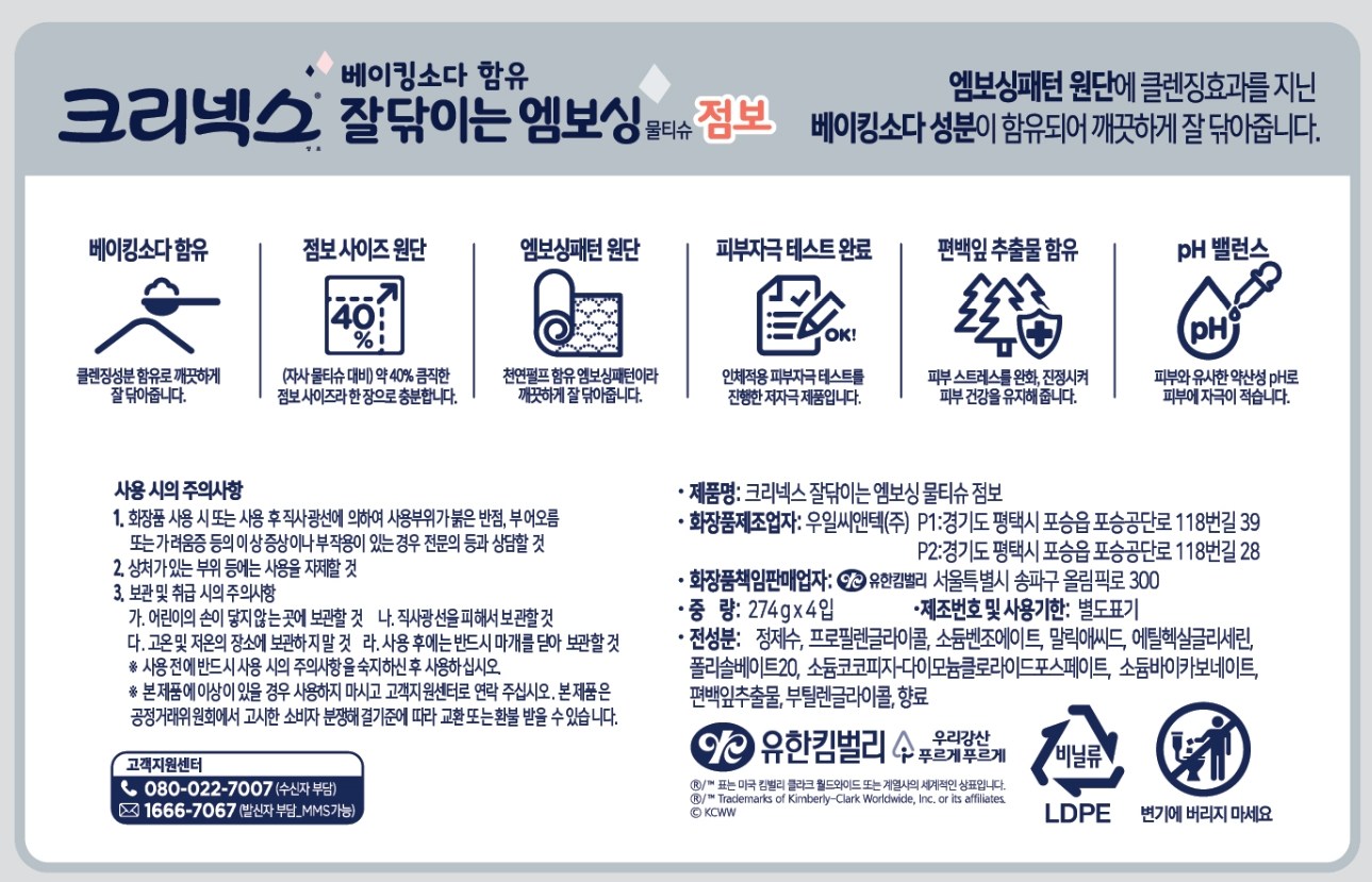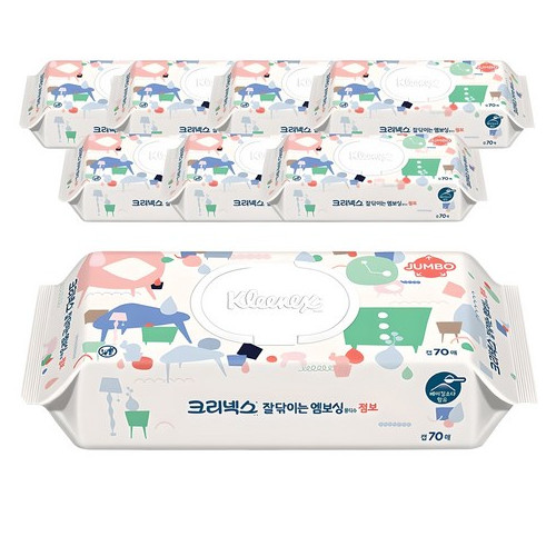 - 크리넥스 잘닦이는 엠보싱 점보 물티슈 캡형, 70매, 8개