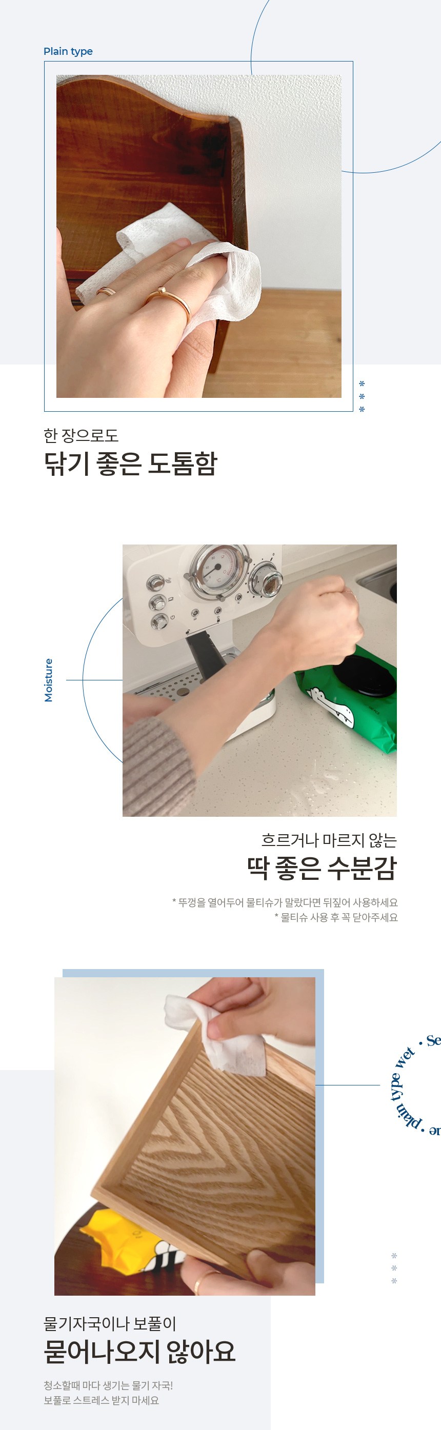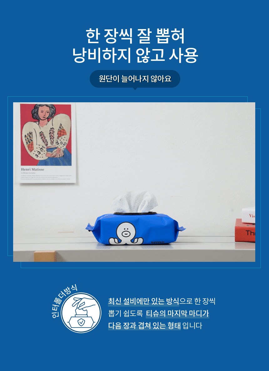 - 적당한 수분감과 원단 크기를 연구해 만든 범용 물티슈
