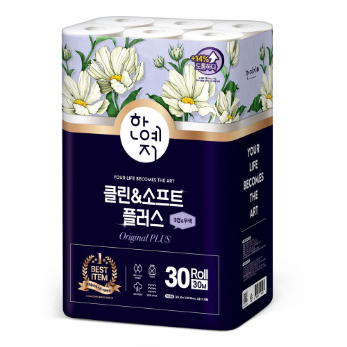 - 한예지 클린앤소프트 플러스 천연펼프 3겹 화장지 30M 30롤 (1팩)