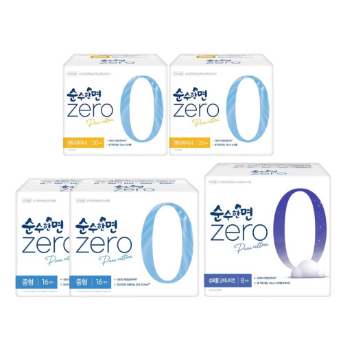 - 깨끗한나라 순수한면 제로 중형(16P) 2팩 + 오버나이트(8P) 1팩+팬티라이너(20P) 2팩
