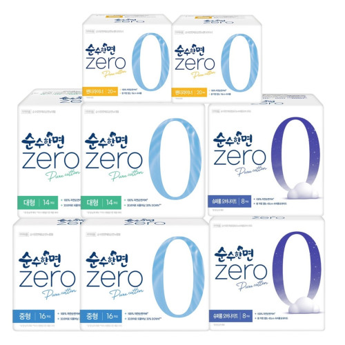 - 깨끗한나라 순수한면 제로 중형(16P) 2팩 + 대형(14P) 2팩+오버나이트(8P) 2팩+팬티라이너(20P) 2팩