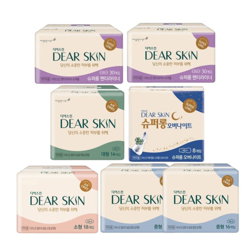 - 깨끗한나라 디어스킨 에어엠보 소형(18P) 1팩+중형(16P) 2팩+ 대형(14P) 1팩+오버나이트(8P) 1팩+팬티라이너(30P) 2팩