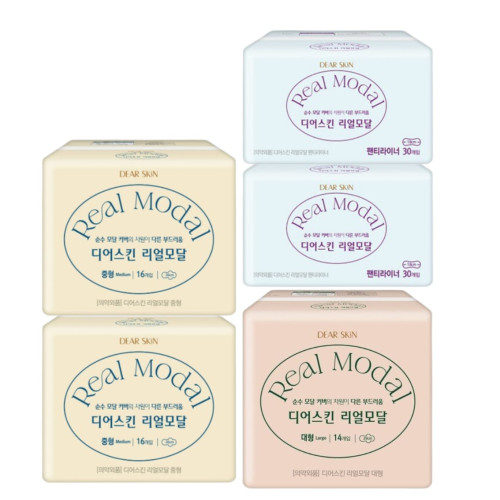 - 깨끗한나라 디어스킨 리얼모달 중형(16P) 2팩+대형(14P) 1팩+팬티라이너(30P) 2팩