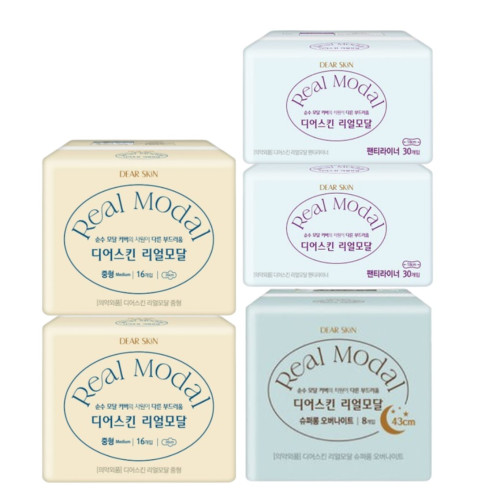 - 깨끗한나라 디어스킨 리얼모달 중형(16P) 2팩+오버나이트(8P) 1팩+팬티라이너(30P) 2팩