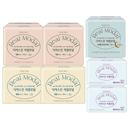 - 깨끗한나라 디어스킨 리얼모달 중형(16P) 2팩+대형(14P) 2팩+오버나이트(8P) 1팩+팬티라이너(30P) 2팩