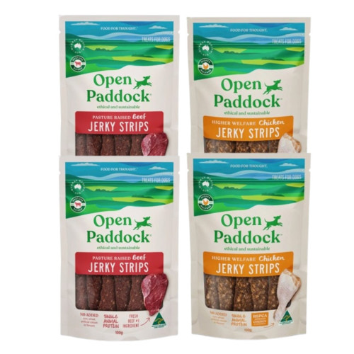 - 오픈패독 프리미엄 단일단백질 동물복지 비프 저키스트립 (100g) 2개+ 치킨 저키스트립 (100g) 2개 (합계4개)