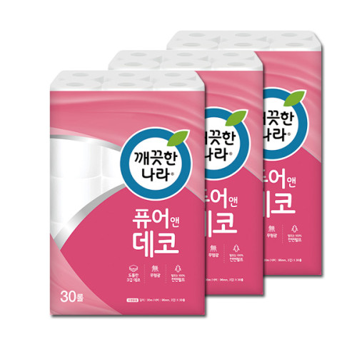 깨끗한나라 화장지 3겹 퓨어앤데코 30m 30롤 (2팩,3팩 선택 구성)