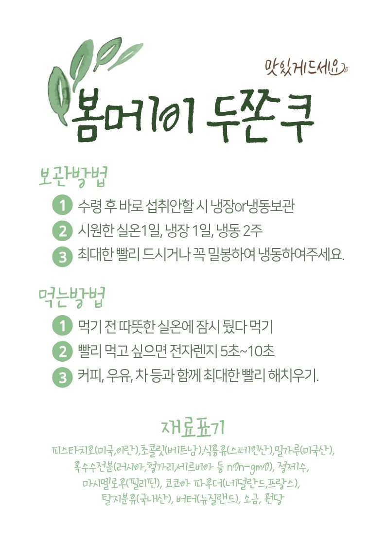 | 원재료명 및 함량 | 피스타치오(미국,이란),초콜릿(베트남),식용유(스페인산),밀가루(미국산), 옥수수전분(러시아,헝가리,세르비아 등 non-gmo), 정제수, 마시멜로우(필리핀), 코코아 파우더(네덜란드,프랑스), 탈지분유(국내산), 버터(뉴질랜드), 소금, 원당 |